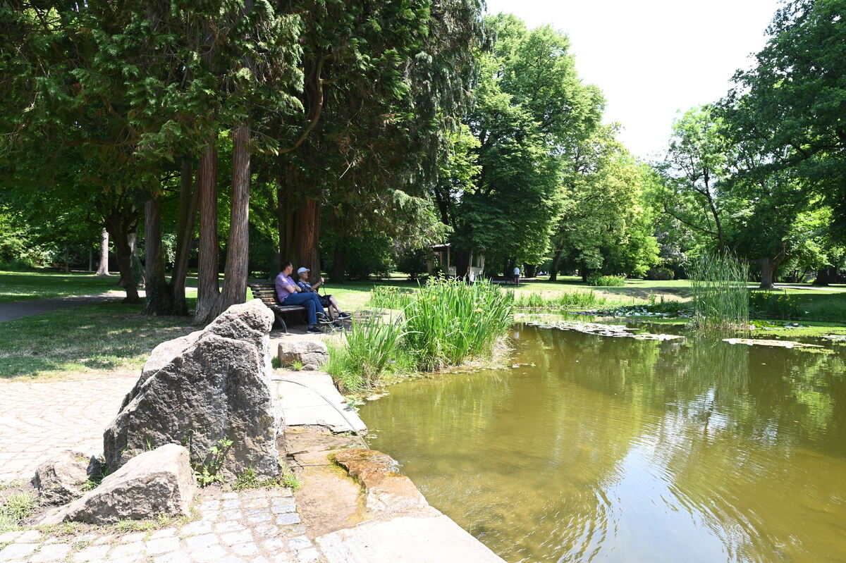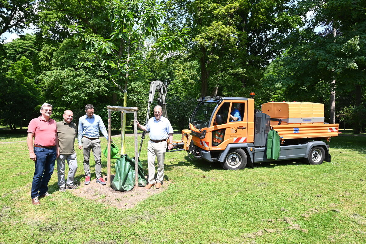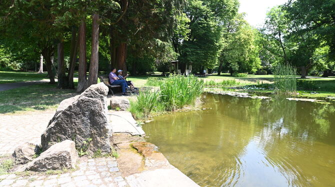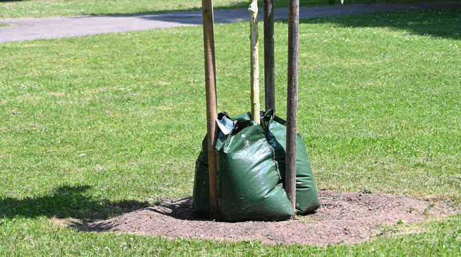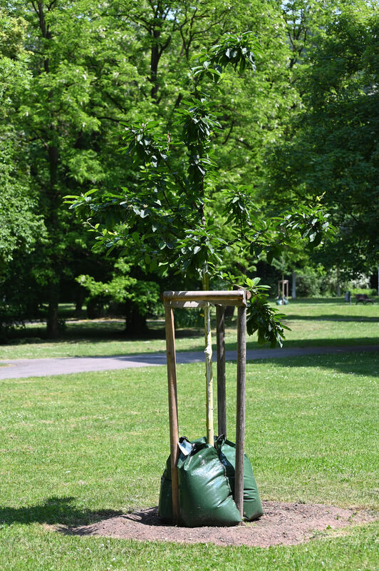 Der Tümpel täuscht, denn tatsächlich haben die Bäume im Stadtgarten in trockenen und heißen Sommern Durst. Die Stadt selbst kann nicht überall sein, bittet daher Anwohner bei jungen Stämmen um den Griff zur Gießkanne.