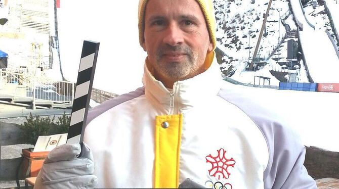 Rainer Köhler mit Filmklappe vor der Oberstdorfer Sprungschanze. FOTO: PRIVAT