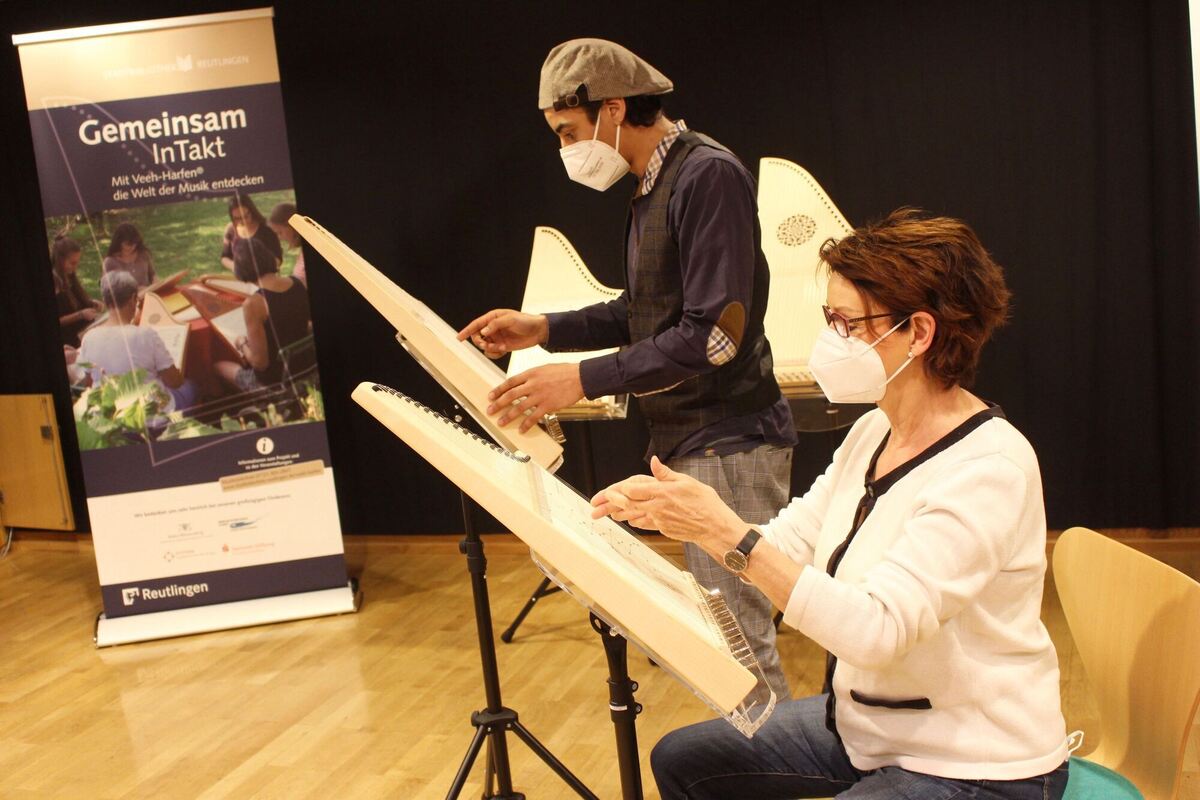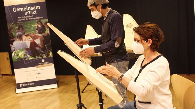 Die Bruderhaus-Mitarbeiter Houcem Giuliano und Gudrun Tacke demonstrieren, wie Veeh-Harfen funktionieren. FOTO: SPIESS