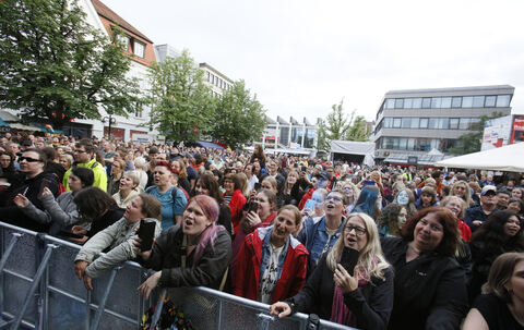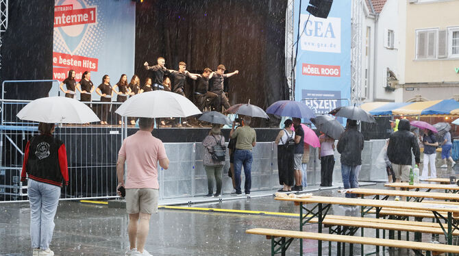 »Regenschirme raus und Poncho an«, schrieb das Stadtmarketing in einem Instagram-Posting. »Auch bei Regen lässt es sich feiern.« Und tatsächlich: Trotz zwischenzeitlichem Starkregen harrten einige Stadtfest-Besucher unter den Pavillons der Vereinsstände aus. Als der Regen nachließ, versammelten sich bereits die ersten mit Regenschirm und Poncho vor den Bühnen.