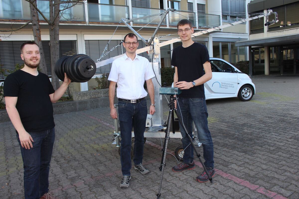 Tim Grabowski (links) und Robin Dorau mit Lehrer Raphael Dannecker und dem von ihnen entwickelten Kamerakran. FOTO: SPIESS