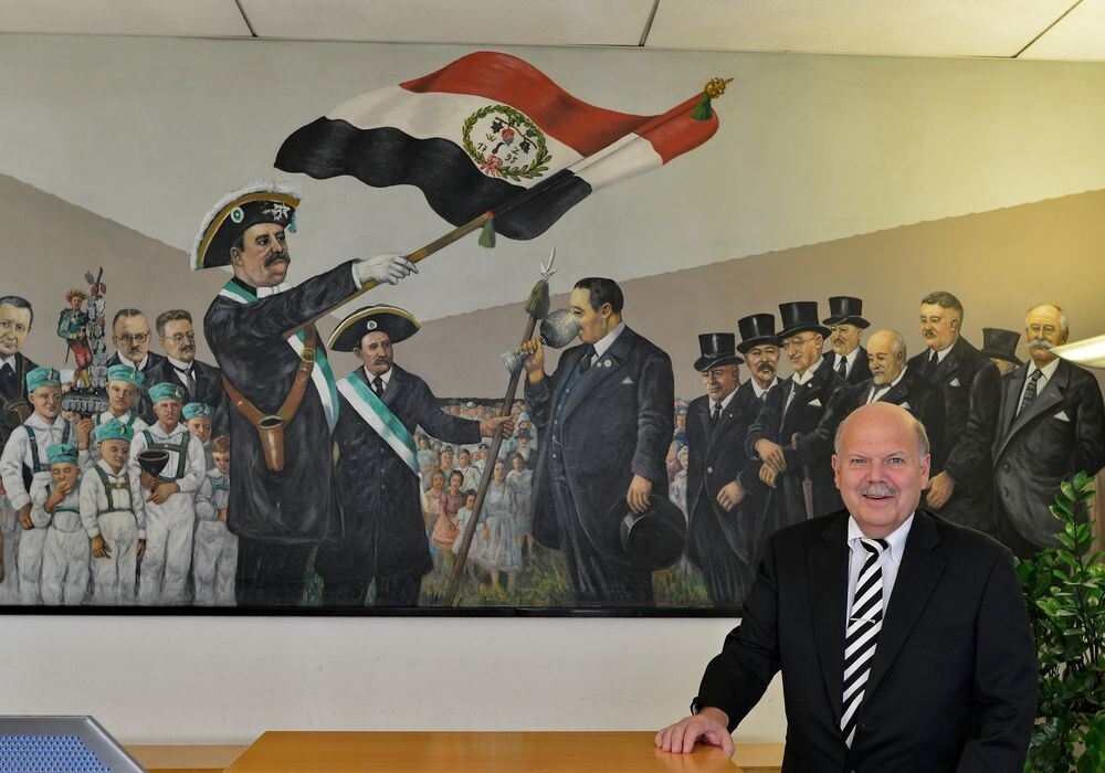 Verleger Valdo Lehari jr.vor dem Bild im GEA-Service-Center am Burgplatz, das sich an einem Foto vom Rebenmännlefest im Jahr 1929 orientiert: zweiter von links, hinter den Rebenmännlebuben, sein Großvater Eugen Lachenmann. Ganz rechts der langjährige Stadtrat und Landtagsabgeordnete Jakob Kurz. Der Fahnenflaiger heißt Georg Käsmann.