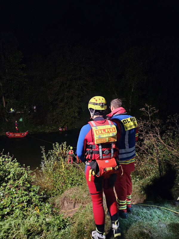 Nach und nach treffen die Helfer am Neckar ein – Hilfeschreie sind in der Dunkelheit zu hören. Schnell wird die Personengruppe lokalisiert. Aus den zahlreichen Einsatzfahrzeugen steigen Einsatzkräfte in Neoprenanzügen und Schutzausrüstung. »Das sind alles speziell ausgebildete Strömungsretter und Fachhelfer der DLRG mit Ziel, sich in die starke Strömung zu begeben, um die Personen zu erreichen«, so Übungsleiter Till Steibli. »Hier ist Manpower gefragt!«