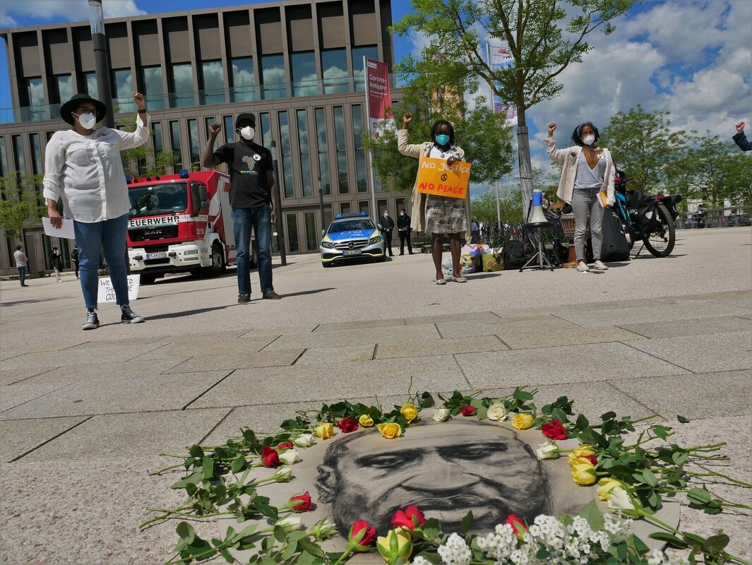 Weltweit gab es in der Folge Demonstrationen gegen Rassismus, auch in Reutlingen im vergangenen Juni. »Die ‚black lives matter‘-Bewegung hat die Menschen auf die Straße gebracht«, so Kinyanjui. Nach der Kundgebung im vergangenen Jahr hatte sich in Reutlingen ein Verein gegründet, mit dem Namen »Blacks connected«. »Wir wollen uns in die Gesellschaft einbringen, wir wollen, dass Schwarze in der Bevölkerung sichtbar werden«, betonte Njeri Kinyanjui am Mittwoch vor der Reutlinger Stadthalle. Rund 30 Interessierte waren dem Kundgebungsaufruf gefolgt, Aster Yeman verlas zunächst zahlreiche Namen von Rassismus-Opfern – jeweils eine oder einer der Demonstrierenden legte zum Gedenken eine Rose neben ein Porträt von George Floyd auf den Boden vor der Stadthalle.