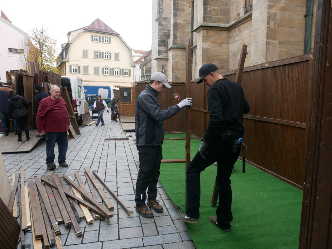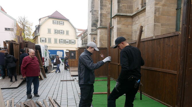 Am Samstag und Sonntag wurde in Reutlingens Stadtmitte viel gewerkelt und geschraubt, um die Hütten für den diesjährigen Weihnachtsmarkt aufzubauen.