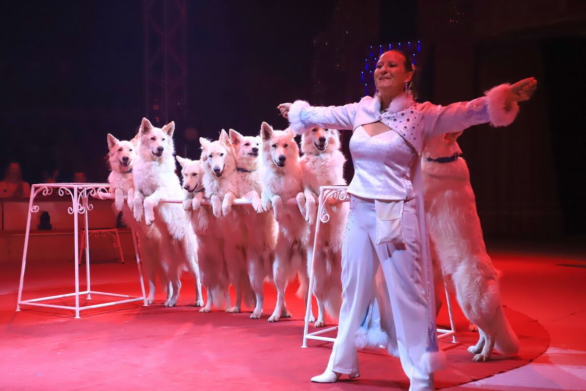 Sie sehen aus wie arktische Wölfe: Rafaela Hondens Dressurnummer mit ihren zehn weißen Schäferhunden gehört zu den Höhepunkten der Show.