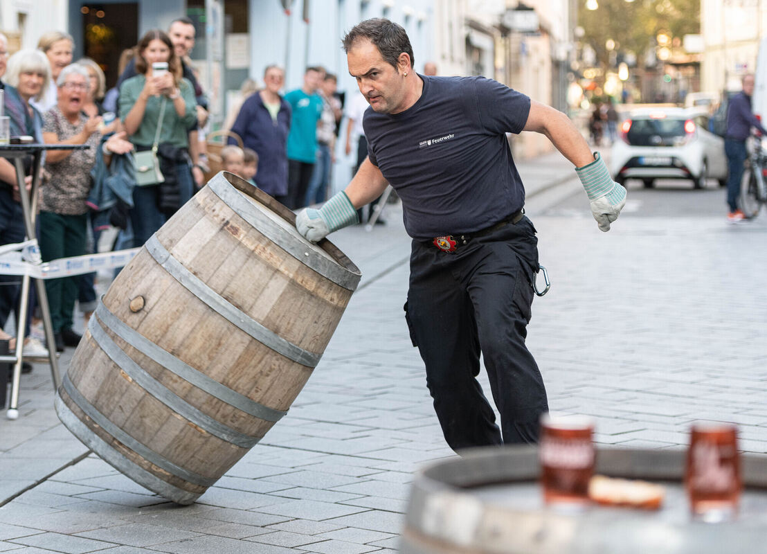 Silvio Müller dreht das Fass scheinbar mühelos. Und in rasantem Tempo. Der Blick ist schon auf das Getränk gerichtet - oder in seinem Fall auf zwei Getränke. Zwei Viertele gilt's zu leeren.