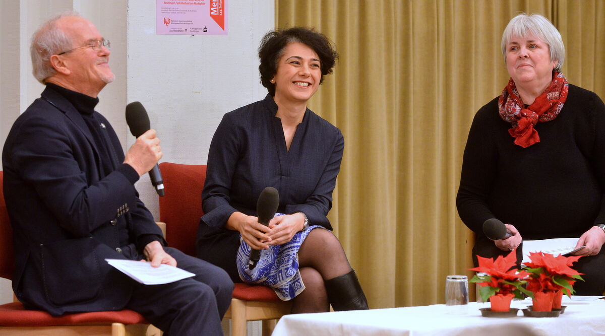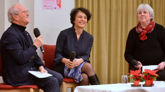 Golineh Atai (Mitte) stellt sich den Fragen der Moderatoren Ulla Heinemann und Professor Norbert Vogel. FOTO: NIETHAMMER