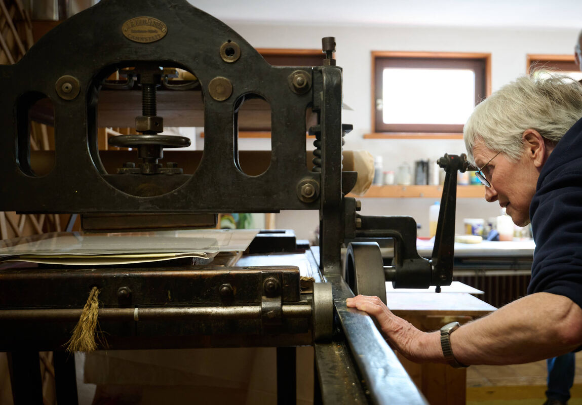 Karin Lengerer-Schäfer an ihrer historischen Druckpresse.
