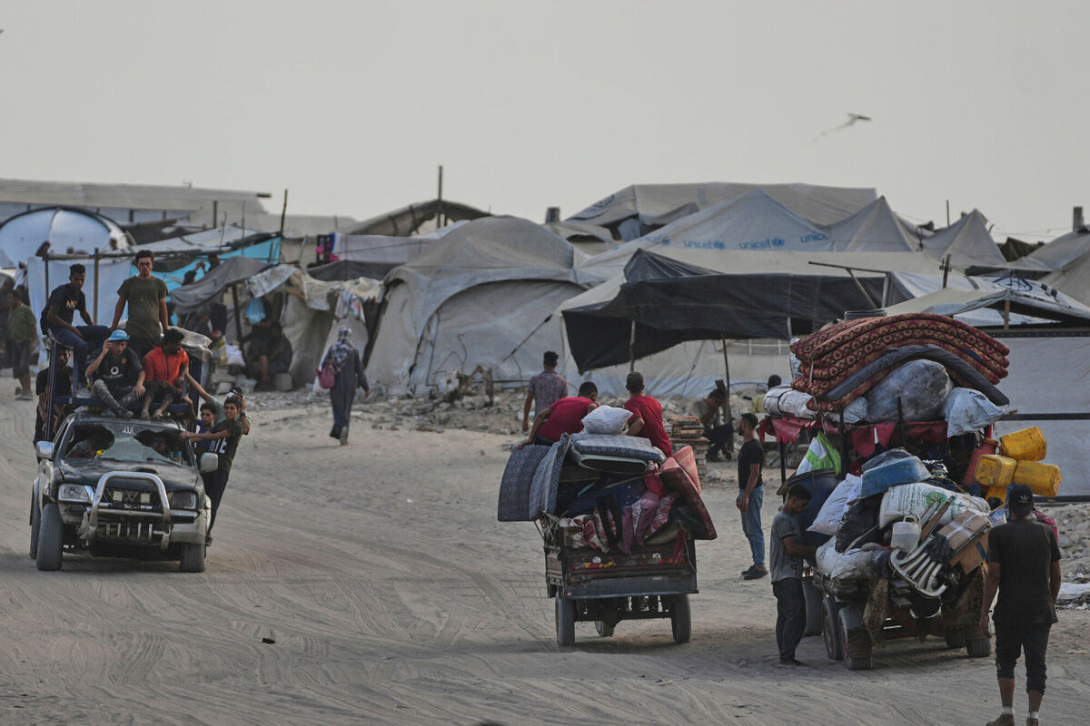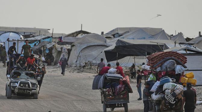 Palästinenser transportieren ihre Habseligkeiten an einem provisorischen Zeltlager am Strand von Gaza-Stadt vorbei. Manche kratzen ihre letzten Ersparnisse zusammen, um nach Ägypten zu fliehen.