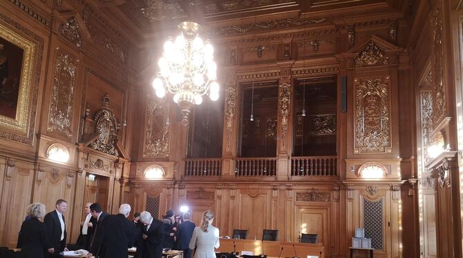 Gegen neun Uhr trifft die Delegation aus Reutlingen am Gericht ein. Oberbürgermeister Thomas Keck, so wie man ihn kennt, mit Fliege. Baubürgermeisterin Ulrike Hotz wirkt angespannt wie damals in Mannheim. Beide nehmen zusammen mit den Anwälten Klaus-Peter Dolde und Michael Uechtritz vorne links im Saal platz. Der Raum ist etwa zur Hälfte gefüllt, eigentlich hatte man einen größeren Andrang erwartet.