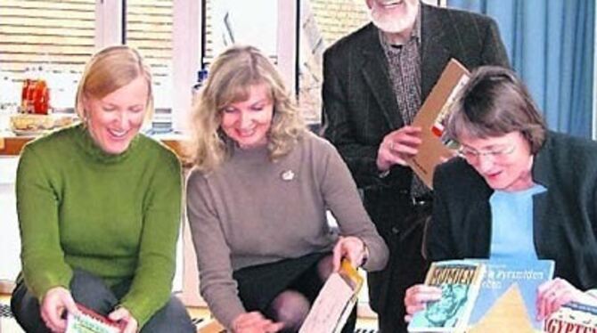 Passionierte Bücherwürmer wühlen selber gern: (von links) Elke Sockel-Zajac von der Jugendbibliothek, Lehrerin Elke Kuhlen, Professor Reinbert Tabbert, Bibliotheks-Chefin Christa Gmelch mit Kisten des Arbeitskreises Schule-Bibliothek.