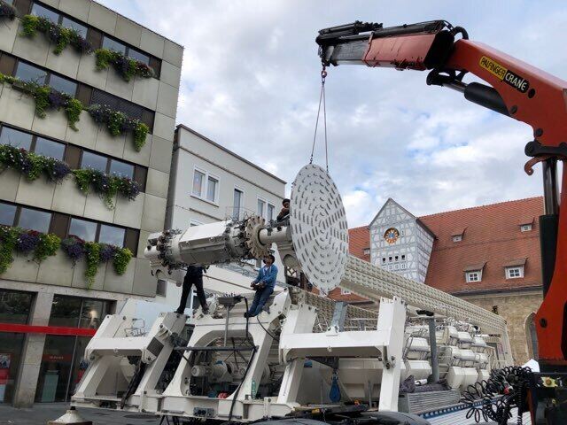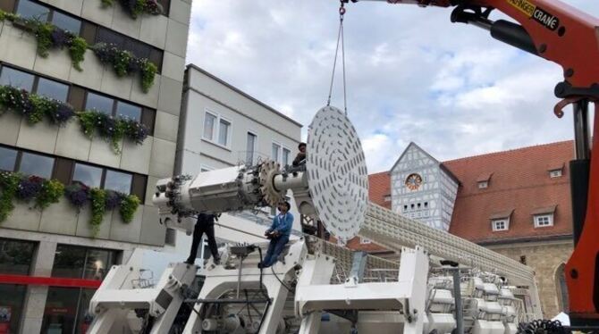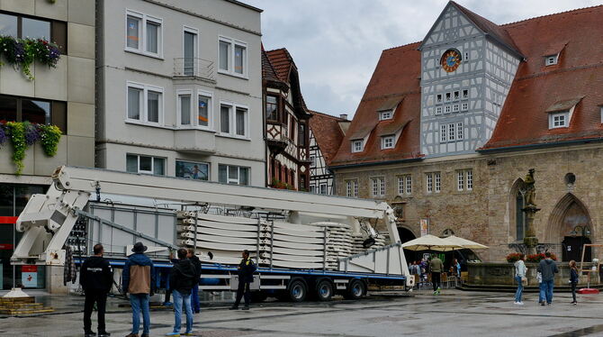 15:35 Uhr Der Aufbau beginnt. »Ich bin jetzt ganz tiefenentspannt«, sagt Christian Wittel. Der Sprecher der Reutlinger Interessengemeinschaft »RT aktiv« schaut sich den Start des Projekts Riesenrad auf dem Marktplatz selbstverständlich live vor Ort an. Auf drei Tiefladern, die jeweils 20 Meter lang sind, werden die ersten Teile fürs Riesenrad angeliefert - die Einfahrt der langen Gefährte in die Innenstadt hat Wittel schon kurz Kopfzerbrechen bereitet, gibt er zu. Aber jetzt, während der GEA mit dem Optiker spricht, sind bereits zwei von drei Tiefladern da - alles hat geklappt.