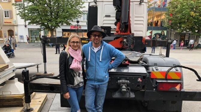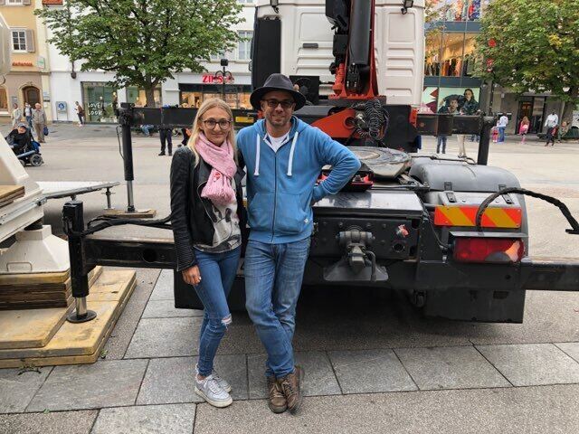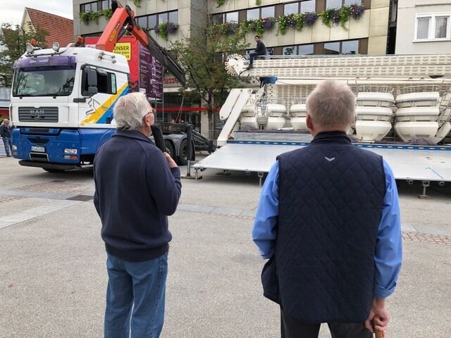 17:45 Uhr Die Passanten auf dem Marktplatz staunen: Herwig und Kurt stehen fasziniert vor dem Tieflader. Die beiden kennen sich eigentlich nicht, lernen sich aber bei der Diskussion über die Riesenradtechnik kennen. Herwig wohnt in Reutlingen, und ist extra zum Aufbau gekommen. Die Aktion findet er klasse. Kurt aus Trochtelfingen begeistert sich besonders für die Technik - und findet es faszinierend, dass eine junge Frau den riesigen Tieflader auf den Platz manöveriert hat.