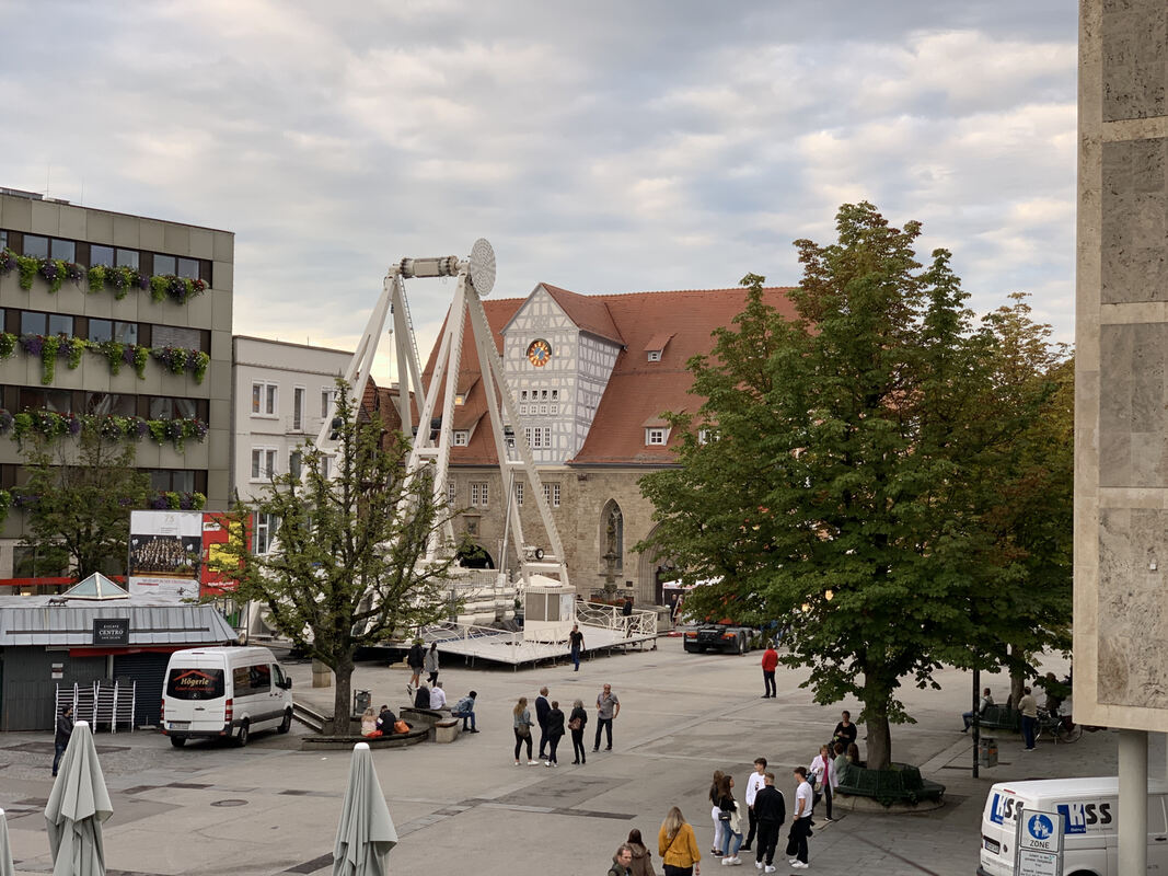Am Kassenhäusschen hängt ein Schild, auf dem die Hygiene-Regeln fürs Fahrgeschäft zu lesen sind: Beim Anstehen gilt Maskenpflicht, erst wenn die Fahrgäste in der Gondel sitzen, dürfen sie die Maske ausziehen. Spender mit Desinfektionsmittel sind aufgebaut, die Fahrgäste werden auf der einen Seite in die Gondel einsteigen und sie auf der anderen Seite wieder verlassen. »Normalerweile bietet eine Gondel Platz für sechs Leute, wir haben die Zahl auf vier reduziert«, erklärt Riesenrad-Besitzer Christian Göbel weiter. Er will auch nicht alle Gondeln bei jeder Fahrt voll besetzen. Wer mit dem Riesenrad fahren will, muss außerdem seine Kontaktdaten angeben - wie beim Restaurantbesuch. Viel Aufwand für Göbel und sein Team; trotzdem sind alle froh, dass nach dem Corona-Stillstand nun zumindest wieder ein wenig Normalität einkehrt und sie wieder Einnahmen haben. Wir verabschieden uns für heute vom Marktplatz und sind morgen wieder vor Ort. Um 15 Uhr wird der Koloss eingeweiht, ab 16 Uhr können Besucher damit fahren.