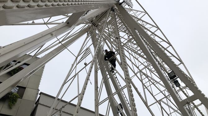 9:53 Uhr Vor der Corona-Pandemie hatte Schaustelle Christian Göbel aus Worms, dem das Riesenrad gehört, elf Saisonkräfte angestellt. Als der Lockdown kam und Göbel auf einen Schlag das ganze Geschäft wegbrach, musste er welche kündigen und welche in Kurzarbeit schicken. Zwei seiner Saisonarbeiter helfen ihm aktuell beim Aufbau in Reutlingen. Einer von ihnen klettert in schwindelerregenden Höhen und montiert Querstreben oben am Rad.