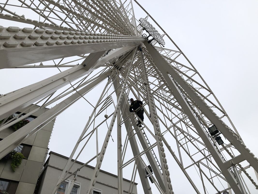 11:10 Uhr Der Koloss, der da gerade aufgebaut wird, wurde 2017 gebaut und trägt den futuristischen Namen »White Star«. Das Rad ist 38 Meter hoch und hat 26 Gondeln.