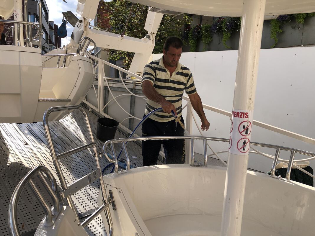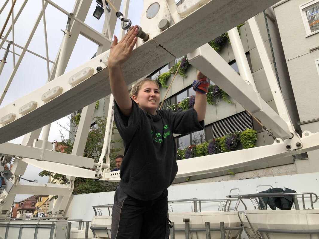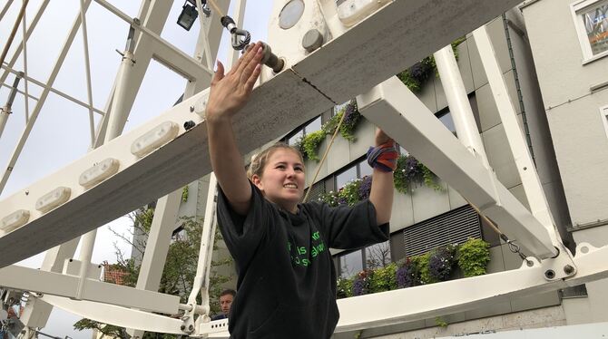 Dass die 17-jährige Lena mithilft, war eine recht spontane Sache, erzählt sie. Eigentlich beginnt sie bald eine Ausbildung als Optikerin. Erfahrung mit dem Aufbau von großen Fahrgeschäften hat sie keine, berichtet sie lachend. Aber scheinbar scheinen eine kurze Einlernzeit und ein vorhandenes Geschick auszureichen.