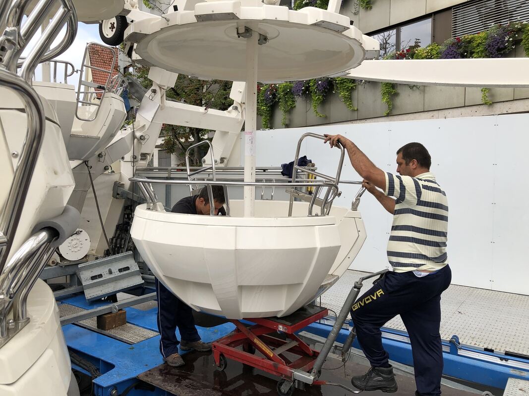 Schausteller Göbel sitzt währenddessen in einer der Gondeln am Schaltpult: Von dort aus kann er das Rad drehen, wenn wieder ein Teilstück montiert ist, oder die Seilwinden steuern, die den Helfern bei der Radmontage helfen.