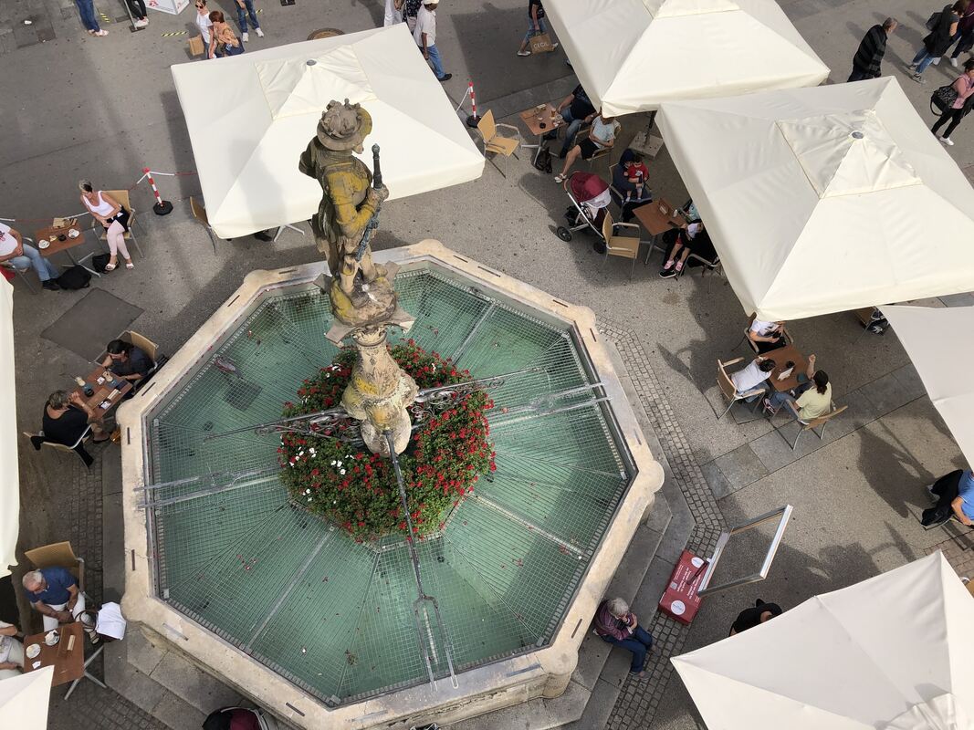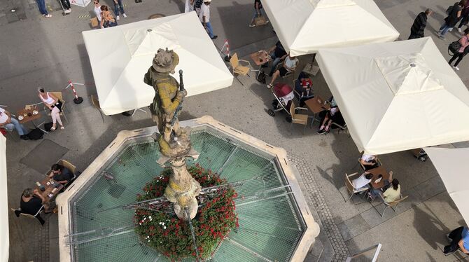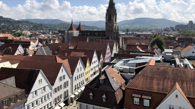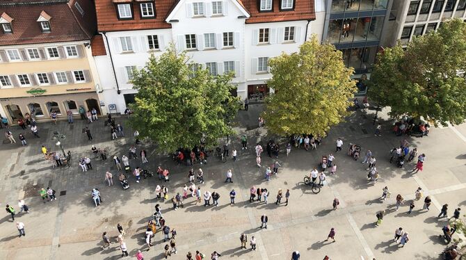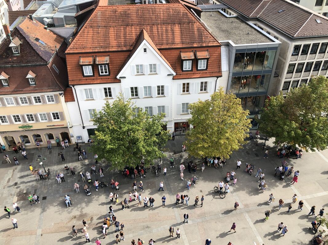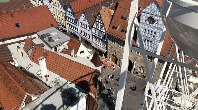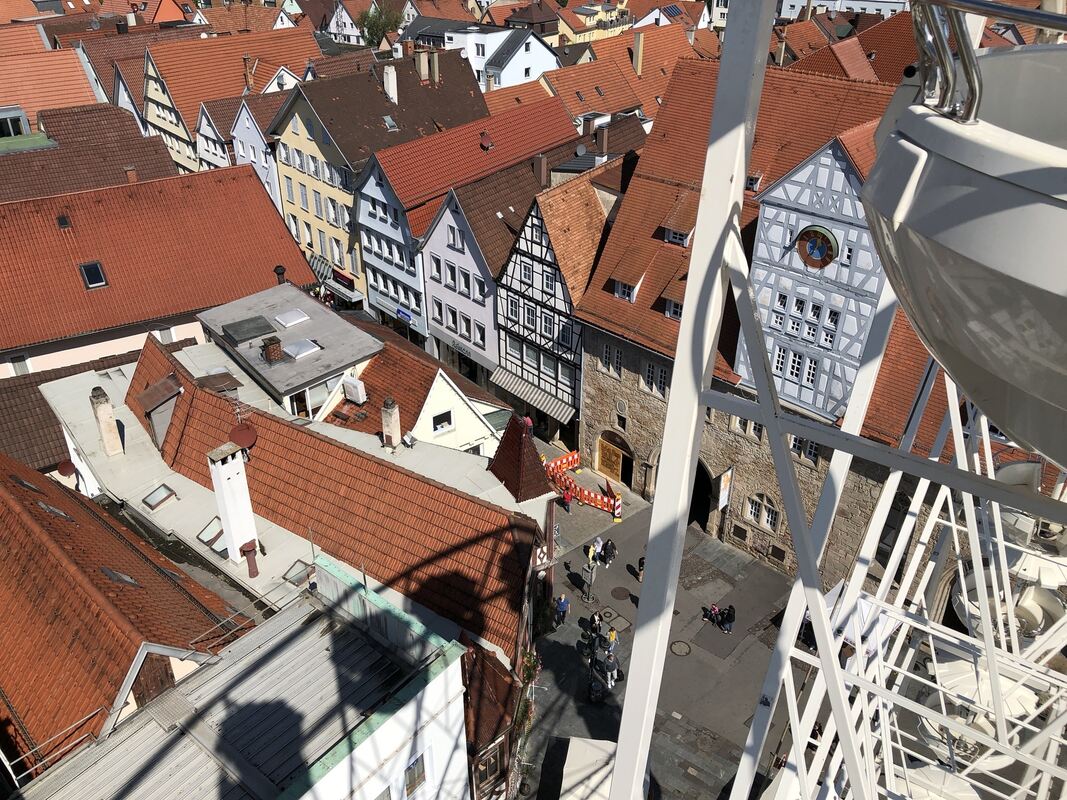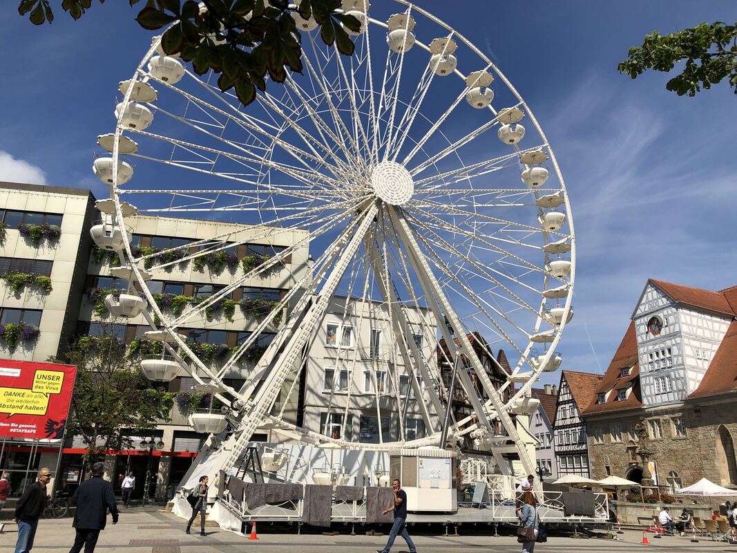 15:30 Uhr Einige Gemeinderäte und Pressevertreter drehen die erste Runde, dann steigen Stück für Stück auch Musikanten der Stadtkapelle ein und spielen - auf viele Gondeln verteilt - im Riesenrad. Von oben eröffnet sich ein toller Ausblick bis nach Tübingen, man sieht die Achalm, die Marienkirche, die Kreiskliniken, viele Gassen der Altstadt, und vieles mehr. Über den ganzen Marktplatz reicht die Schlange der Menschen, die sich anstellen, um auch eine Runde drehen zu können: Jugendliche, Familien, Kinder mit ihren Großeltern, Seniorengruppen. In der Schlange herrscht Maskenpflicht, in der Gondel dann nicht mehr. Wer fahren will, muss seine Kontaktdaten hinterlassen, Ein- und Ausgang der Plattform sind voneinander getrennt, es stehen mehrere Spender mit Desinfektionsmittel für die Fahrgäste bereit.