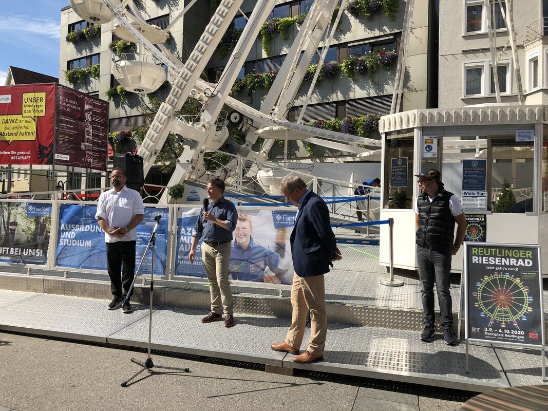 15 Uhr Christian Wittel, Uwe Grauer und Reutlingens Oberbürgermeister Thomas Keck eröffnen feierlich das Riesenrad. Die Stadtkapelle spielt, die Sonne strahlt, und viele Besucher sind gekommen um nach der Eröffnung gleich auch eine Runde zu drehen.