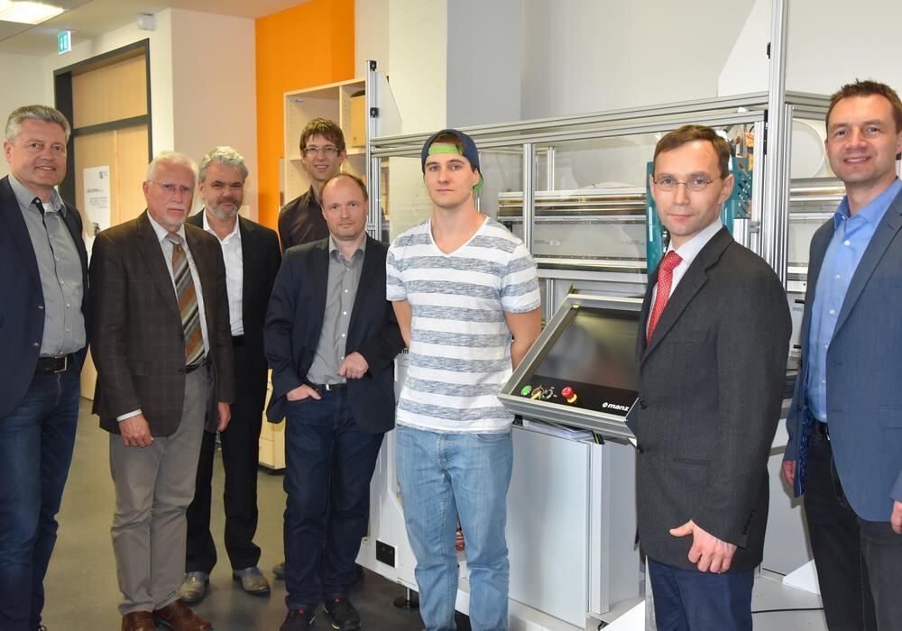 Anlässlich einer neuen Applikation des Speedpickers trafen sich die Beteiligten zur Live-Demonstration: Eduard Ams (Manz), Professor Gerhard Gruhler (Vizepräsident der Hochschule), Oliver Heilig (Beckhoff), Daniel Metzger (hinten, Beckhoff), Stephan Lausterer (Manz), Bachelor-Absolvent Martin Böhmer, Professor Schullerus und Stefan Bez (Manz). FOTO: HOCHSCHULE