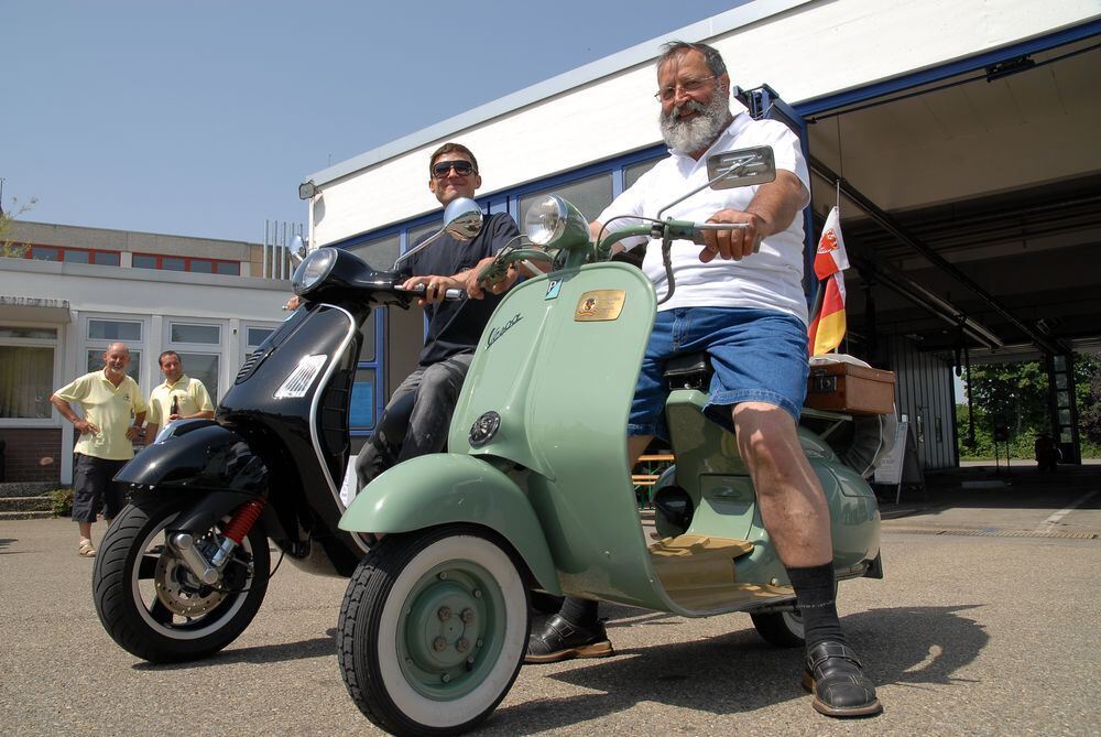 Zwei Vespa-Generationen: Links der im März 2010 gewählte Erste Vorsitzende Dirk Mezger auf der brandneuen Vespa Gts 300ie, Baujahr 2010 und; daneben: Erwin Pedroß auf seiner Vespa 125U, Baujahr 1953.