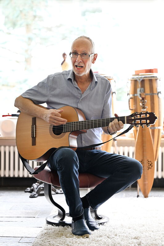 Der schwäbische Liedermacher Roman Mangold (69) beim Proben in seinem »Büro« in der Reutlinger Römerschanze.