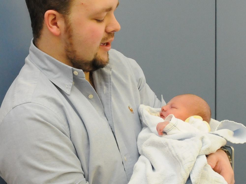 Stolzer Vater: Dominik Sperth mit seiner kleinen Romy Lina. Der Herr Papa ist (fast) vom Fach, denn er arbeitet als Technischer Assistent im OP-Team der Klinik und betreut unter anderem Kaiserschnitt-Patientinnen.