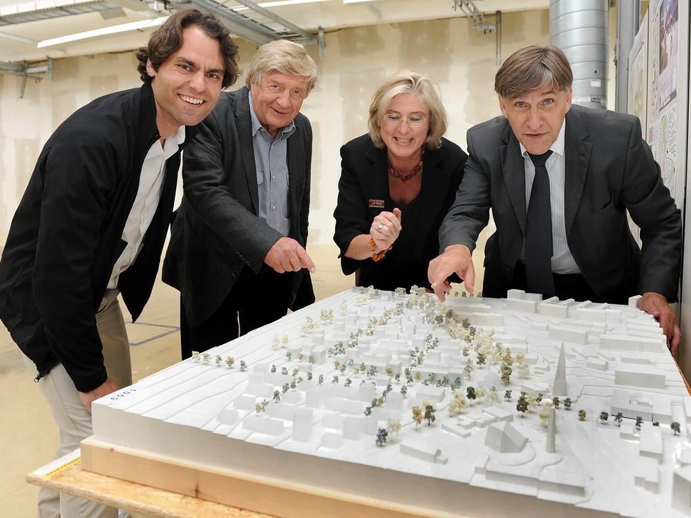 »Integrative Anbindung«: Gartenarchitekt Eric Schuler, Architekt Dieter Raichle, Baubürgermeisterin Ulrike Hotz und GWG-Chef Karl-Heinz Walter (von links) mit dem Entwurf des ersten Preisträgers für die Süderweiterung von Orschel-Hagen.