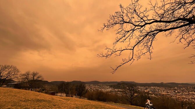 STUTTGART. Warme Luft bringt wenige Tage vor Ostern erneut Saharastaub nach Reutlingen. »Es kommt heute schon allmählich an«, sagte Thomas Schuster, Meteorologe vom Deutschen Wetterdienst (DWD) auf GEA-Anfrage. »Der Schwerpunkt ist aber erst am Mittwochabend.« Dann könnte sich der Himmel wieder rötlich färben. Das Farbenspiel werde aber vermutlich nicht ganz so intensiv wie Mitte März, als der Saharastaub tagelang in Baden-Württemberg in Erscheinung getreten war. »Es sind diesmal etwas andere Prozesse in der Atmosphäre im Gange.«