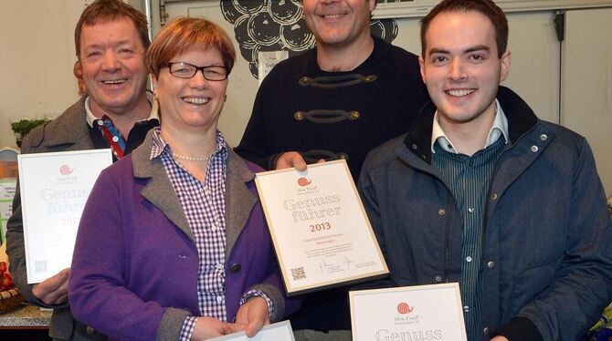 Ihre Speiselokale werden im Genussführer empfohlen (von links): Hans-Heinrich Weeger (»Hirsch«, Böhringen), Inge Tress (»Rose«, Ehestetten), Jürgen Autenrieth (»Hermann«, Münsingen) und »Kaiser«-Küchenchef Davor Slutaj (Bieringen).