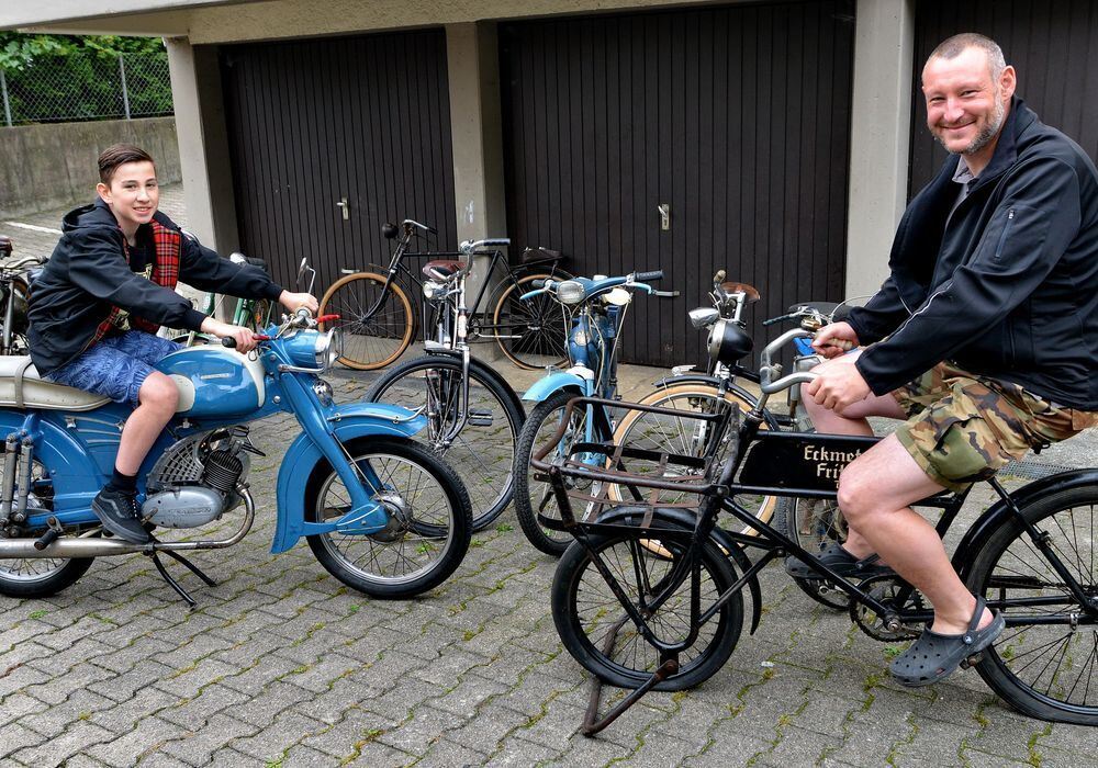 Wenn der Vater mit dem Sohne: Lukas (links) und Oliver Albrecht sammeln alte Zweiräder und richten sie wieder her. FOTO: NIETHAMMER