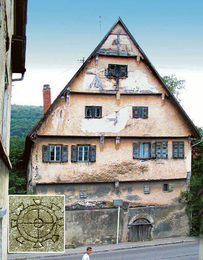 Windschief, aber »das wird noch weitere Jahrhunderte halten«: Hauptstraße 38 in Gönningen, Baujahr 1510 - älter noch als das benachbarte »Kloster« der frommen Beginen-Schwesternschaft. Ein Mühlrad ziert den Schlussstein über dem Kellereingang.