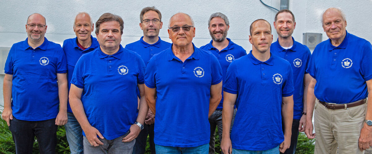 Der Vorstand des Schachvereins im Festjahr 2021 (von links): Oliver Breitschaedel (Pressewart), Peter Ziese (Senioren-Bevollmächtigter), Bernd Staufenberger (Jugendleiter), Oliver Maas (2. Vorsitzender), Jürgen Erler (1. Vorsitzender), Philipp Jetter (Spielleiter), Manuel Meier (Tunierleiter), Andreas Feustel (Kassierer), Peter Flohrs (Schriftführer). FOTO: VEREIN