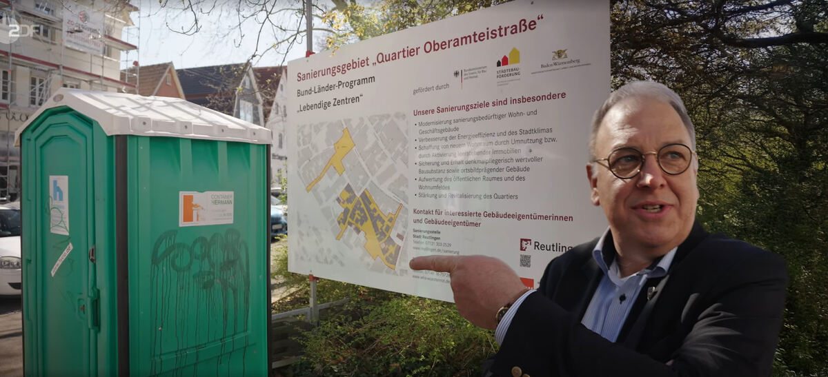 Christian Sievers ist darin der Frage nachgegangen »Wie retten wir unsere Städte – Leben statt Leere«. Ein Drehort war auch Reutlingen. Keck referiert beim Rundgang durch die Altstadt mit dem Fernsehteam staatsmännisch über die Krisenlage der Deutschen Innenstädte im Allgemeinen und Besonderen, bis er in der Kanzleistraße ein Dixi-Klo entdeckt – direkt vorm Informationsschild zum »Sanierungsgebiet Oberamteistraße«: Das Kamera-Team hält drauf, filmt die Tirade.