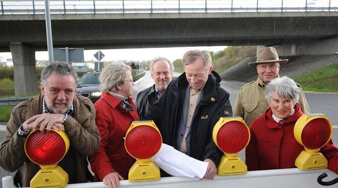 Bezirksbürgermeister und SPD-Stadträte aprilwettergeschüttelt am Efeuknoten: Johannes Schempp (von links), Edeltraut Stiedl, Werner Schenk, Helmut Treutlein, Dr. Lutz Binder und Suse Gnant.