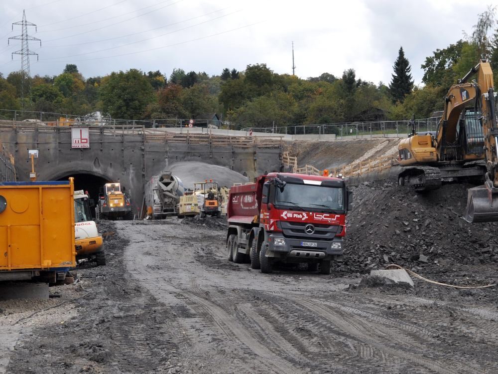 Die Baustelle am nördlichen Ende des Tunnels: hinten die Einfahrt zum Rohbau, rechts wird der Tunnelausbruch auf Lastwagen verladen, um abtransportiert zu werden.