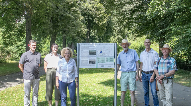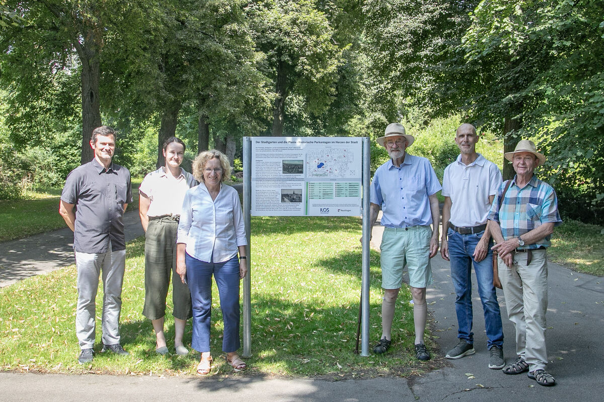 Endlich steht das Schild am Eingang des Stadtgartens. Das freut (von von links): Georg Frey und Annette Aichele vom Amt für Grünflächen und Umwelt, Baubürgermeisterin Angela Weiskopf, Dr. Jochen Böckem, Dirk Laws, ILOS Sprecher Karl-Heinz Krauß.
