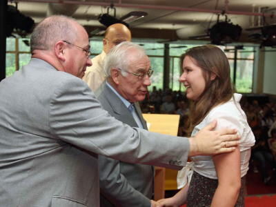 Michael Vogelbacher (links) und Albert Schuler beglückwünschen Friederike Zenker zum Hauptpreis, einem mehrwöchigen College-Kurs in den USA.