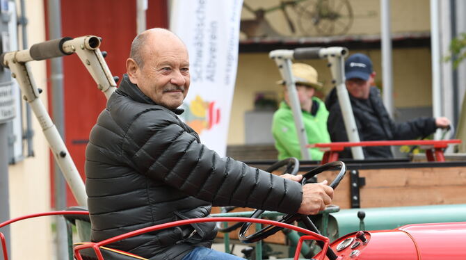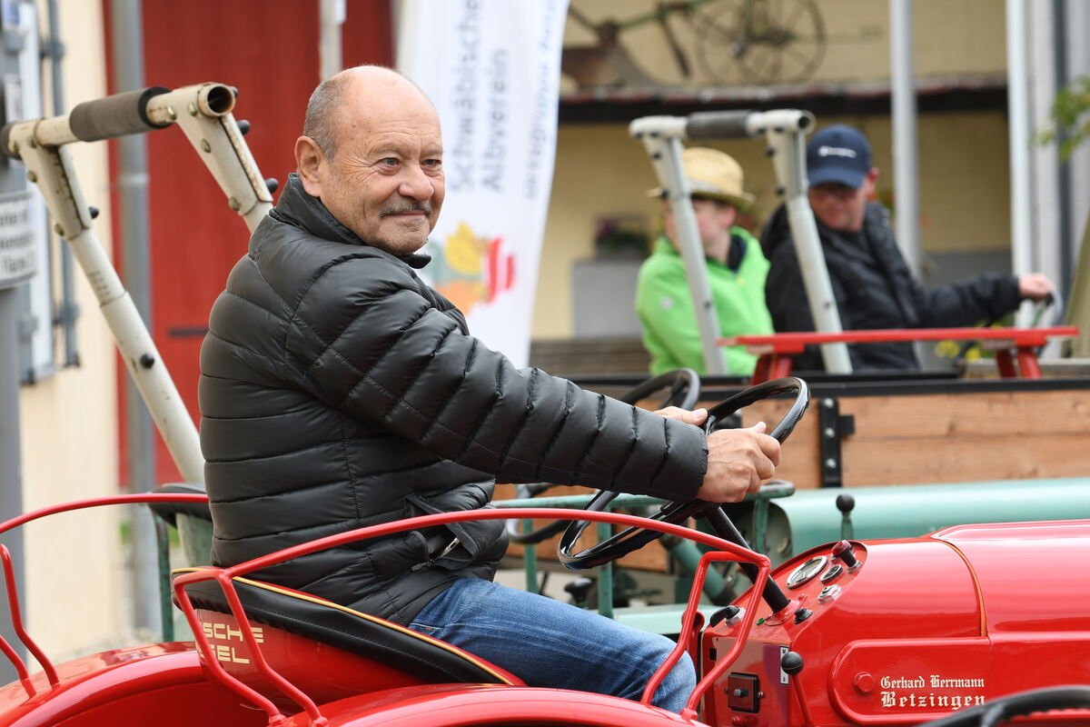 Beim »Museum im Dorf« steht dieser Porsche in einer langen Reihe von historischen Schleppern und Raritäten wie Bernhard Bachors Unimog aus den 50er-Jahren, was Mädchen und Jungs ebenso begeistert wie die Organisatoren der Sichelhenke von der Ortsgruppe Betzingen des Schwäbischen Albvereins sowie vom Förderverein Ortskern Betzingen. Das kleine – aber sehr feine – Volksfest ist zur Erinnerung an einen Bauernfeiertag vor langer Zeit entstanden. Bezirksbürgermeister Friedemann Rupp, der auch Vorsitzender der Albvereins-Ortsgruppe ist, freut sich über Hunderte Besucher, für deren leibliches Wohl das Kochteam des Fördervereins in gewohnt kalorienhaltiger Weise sorgt. So gibt es nach der Schlepperbesichtigung gerne Kartoffelschnitz und Spatzen oder Zwiebelkuchen mit Speck. Besonders empfehlenswert, sagt Annette Kreiser an der Kasse, sind die zahlreichen Backwaren, »alles hausgemacht, da wurde den ganzen Samstag lang gebacken. Meine Mutter hat einen Apfelkuchen beigesteuert«.