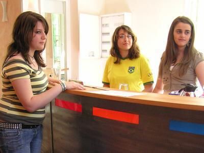 Stolz auf die neue Theke: Schülerinnen der Hermann-Kurz-Schule.