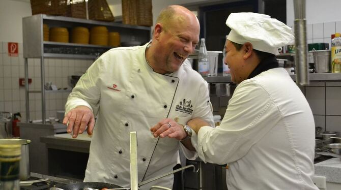 Von wegen Stress in der Küche: Jugendleiter Dirk Wooßmann (links) sorgt selbst bei Zeitdruck für gute Stimmung bei Teilnehmer Juan Antonio Guzman.