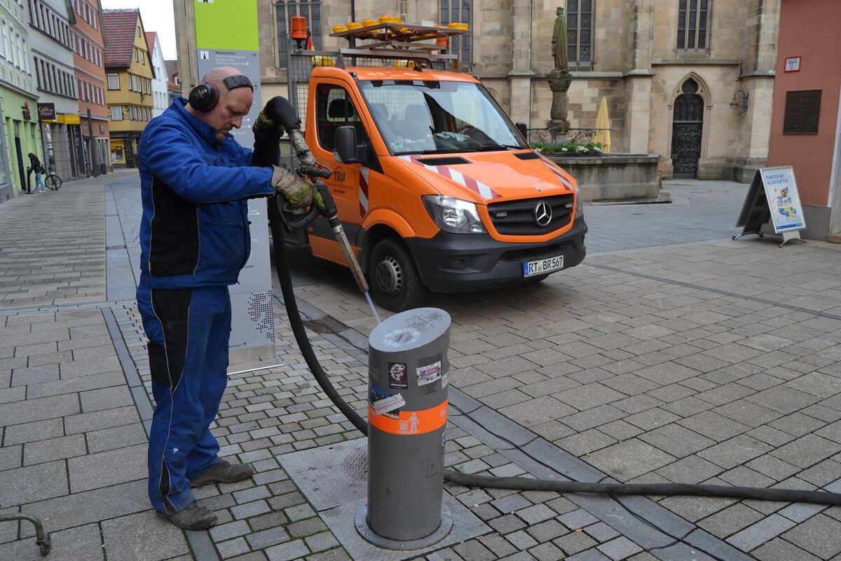 REUTLINGEN. Die Technischen Betriebsdienste Reutlingen haben ein Spezialunternehmen beauftragt, das Aufklebern und Schmierereien in diesen Tagen mit Trockeneis zu Leibe rückt. »Wir sind von Bürgern, Geschäftsleuten und Kommunalpolitikern angesprochen worden, haben es aber auch schon selbst festgestellt und Bedarf zum Entfernen gesehen«, sagt Stefan Kaufmann, Leiter der Technischen Betriebsdienste Reutlingen (TBR).