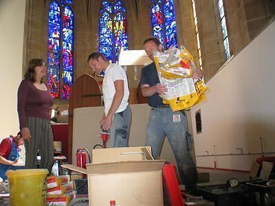 Noch ist der Innenraum der Nikolaikirche wenig einladend. Aber im August soll das Café fertig sein, so die Hoffnung von Pfarrerin Sabine Drecoll. Dann kommen auch die 1962 vom Stuttgarter Kunstmaler Christian Oehler geschaffenen Chorfenster zur Geltung.