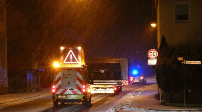 In Bad Urach machte das Wetter dem Verkehr derweil in den frühen Morgenstunden ebenfalls zu schaffen: Einige Schwertransporter waren laut Polizei Reutlingen um 4 Uhr am Morgenauf der L250 von Bad Urach nach Hülben unterwegs. Einer der Schwertransporter blieb schließlich an einem Albaufstieg im Schnee stecken. Das teilte die Polizei dem GEA auf Nachfrage mit. Zunächst sei versucht worden, durch ein Räumfahrzeug die Steige zu streuen und dem Transporter damit das Vorankommen zu erleichtern. Nachdem dieses Vorgehen keinen Erfolg zeigte, mussten Schneeketten aufgezogen und der Schwertransporter mit einem Radlader den Albaufstieg hochgezogen werden. Ab 5:45 Uhr war für den Verkehr daher laut den Beamten kein Durchkommen - die Straße war voll gesperrt. Erst ab 7:45 Uhr war die Steige wieder befahrbar.