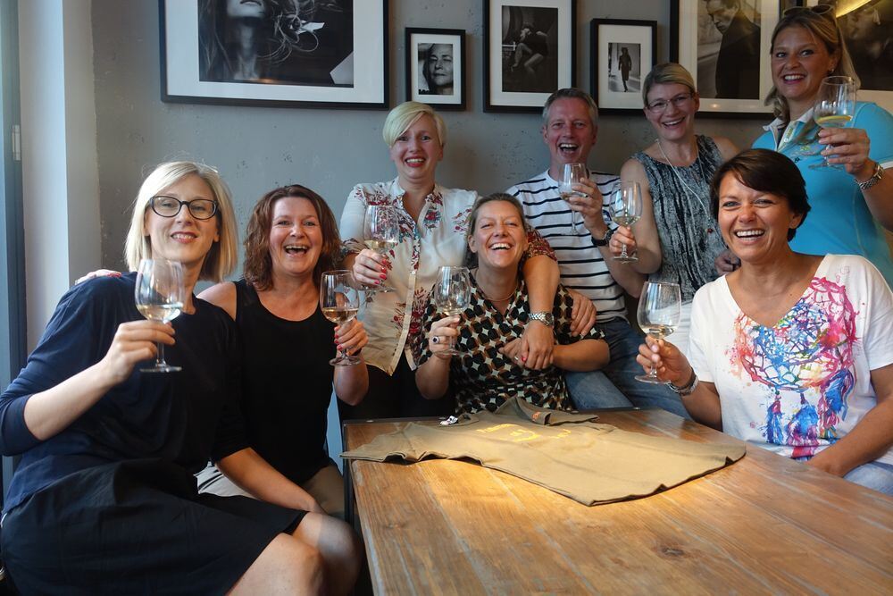 Daniela Schwaibold, Catrin Häußler, Bettina Schwaibold, Karin Münzing, Jürgen Benz, Gaby Junginger, Stefanie Frech und Daniela Wenz (von links) sind eine verschworene Truppe. Seit vielen Jahren kennen sie sich. Jeden Freitag treffen sie sich um 18 Uhr im Benz Mode-Café – es sei, denn, es ist Reutlinger Herbst.
