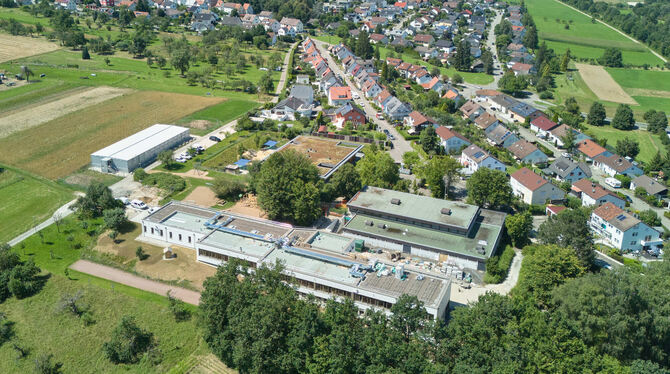 Blick auf das Schulgelände in Sickenhausen von oben: Links im Hintergrund die Containerbauten, länglich im Vordergrund die sanierte Schule, dahinter die Turnhalle des Dorfes.