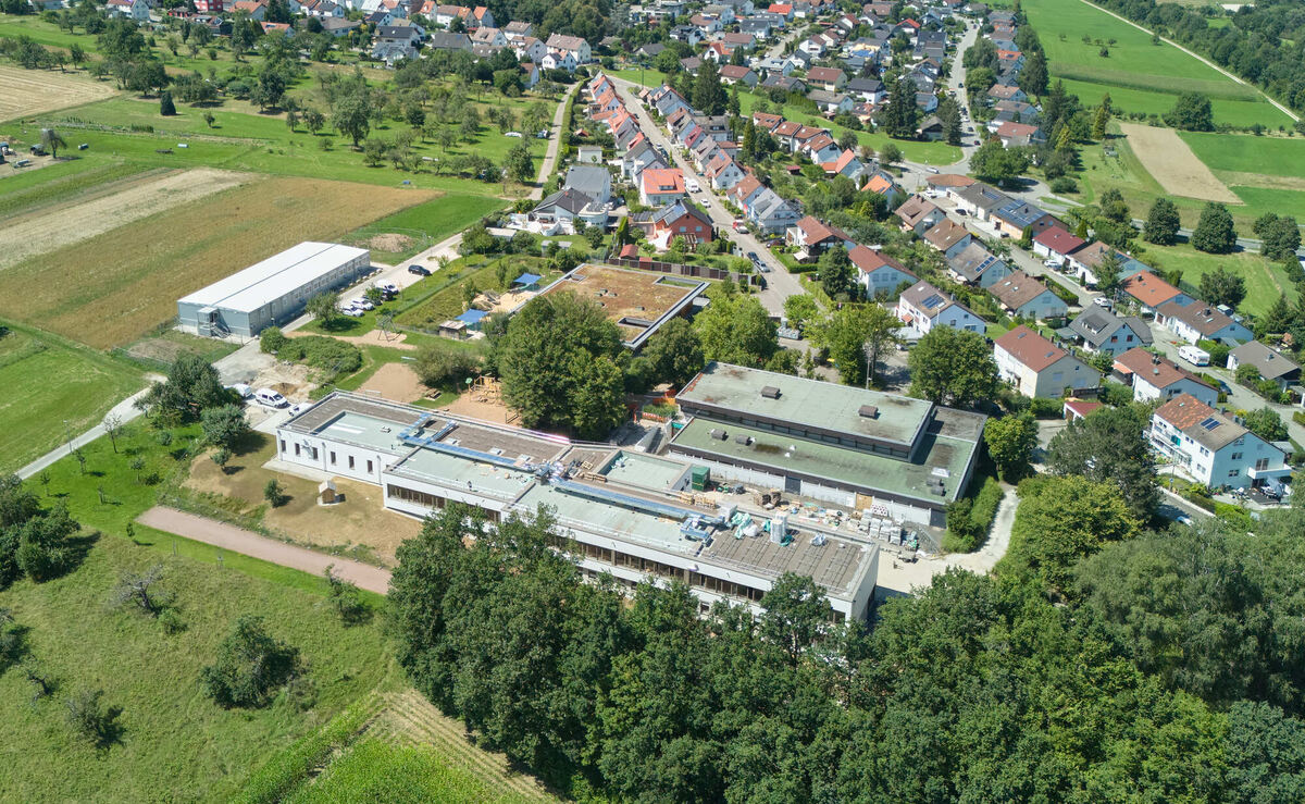Blick auf das Schulgelände in Sickenhausen von oben: Links im Hintergrund die Containerbauten, länglich im Vordergrund die sanie