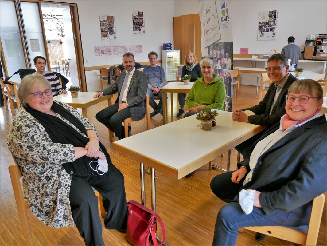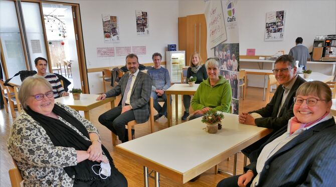 Margaretha Kleiser (von links), Felix Mezger, Norbert Pellens, Jörg Meißnest und Katrin Lenckner, Beate Schmid, Dr. Joachim Rückle und Katja Otter freuen sich gemeinsam über das Schulkochprojekt im Reutlinger Hohbuch-Café.